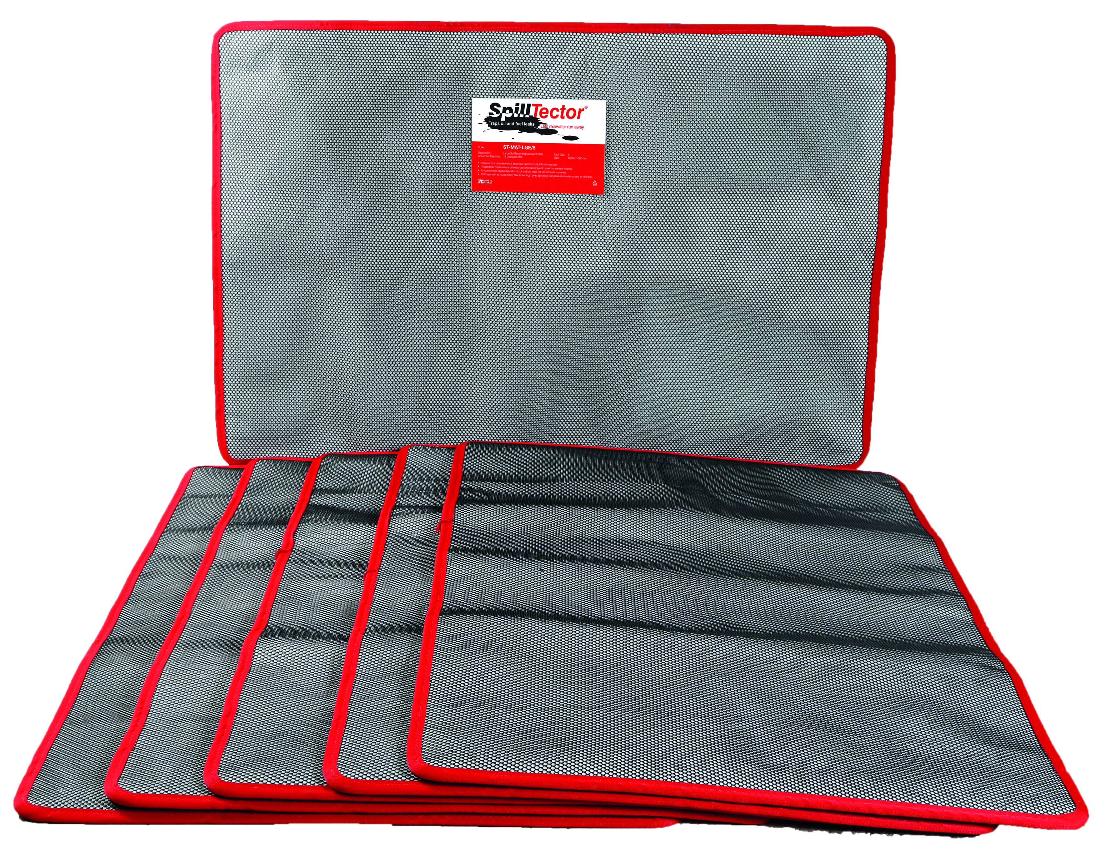 Pack of Five Large SpillTector Replacement Mats. OIL & FUEL LEAKS, TRAPPED Designed for use under plant and machinery SpillTector® catches and absorbs oil, fuel and AdBlue® leaks. ENVIRONMENTAL PROTECTION Contaminants are trapped in the unique absorbent laminate while clean rainwater is allowed to run away; optimum practicality for outdoor use. USES • Under mobile plant and machinery • Containment of oil, fuel and chemical leaks • Protection of sensitive ground • Under mobile bowsers • Garden machinery servicing and refueling