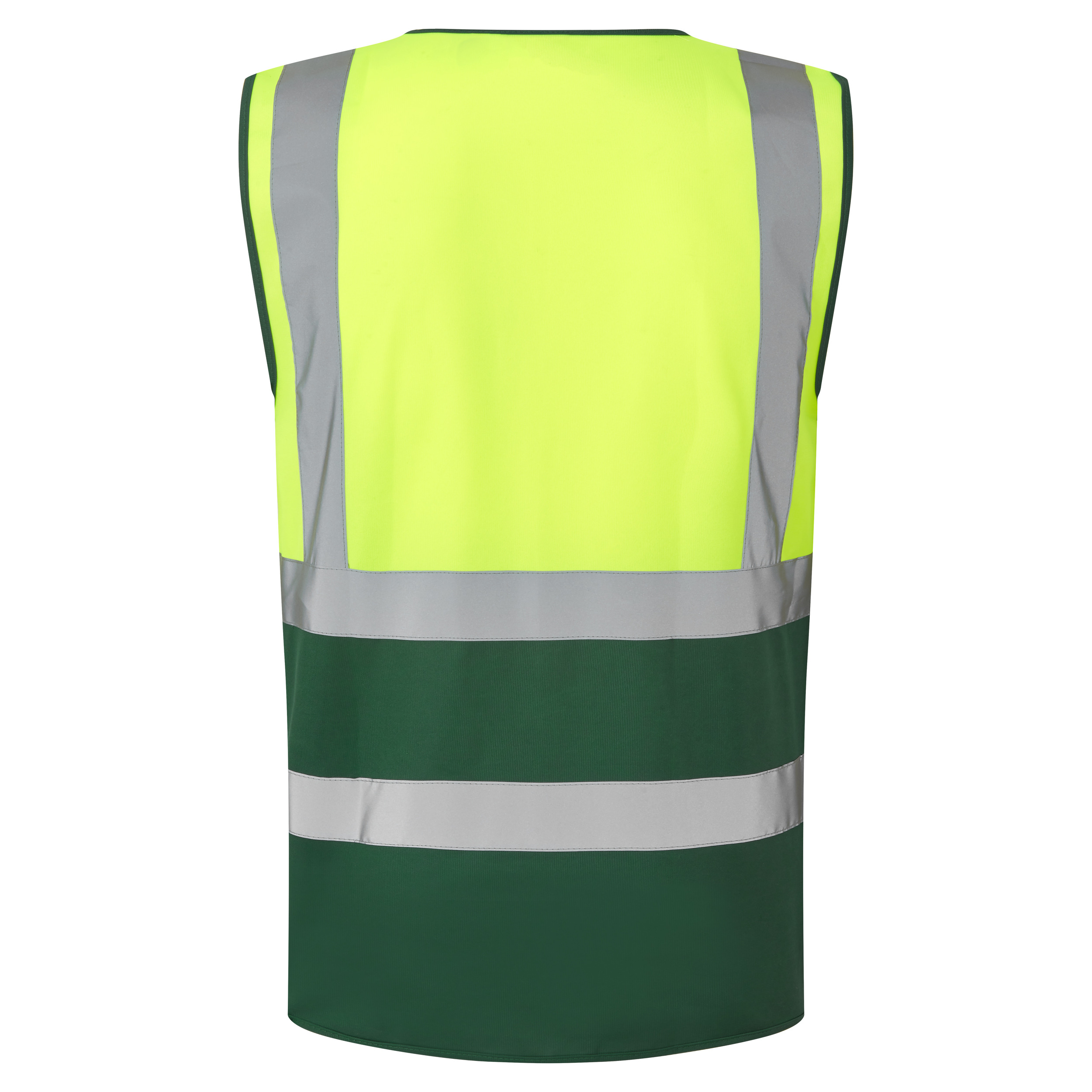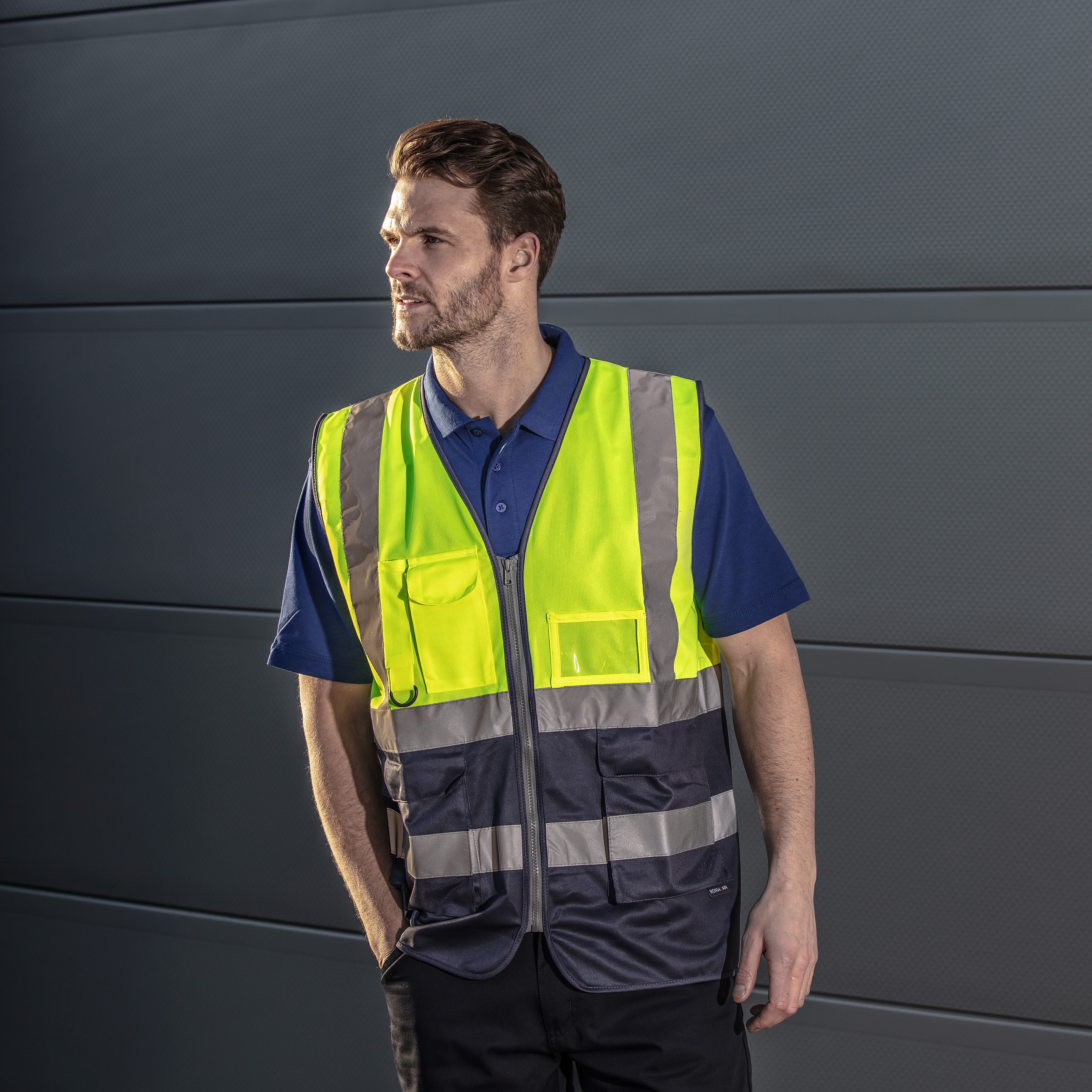 ROKWEAR Hi-Vis Clothing. 100% knitted polyester with zip fastened, contrasting trim colour and D-Ring. Several pockets including two front bellowed storage pockets, ID pocket, mobile phone pocket and double pen pocket.